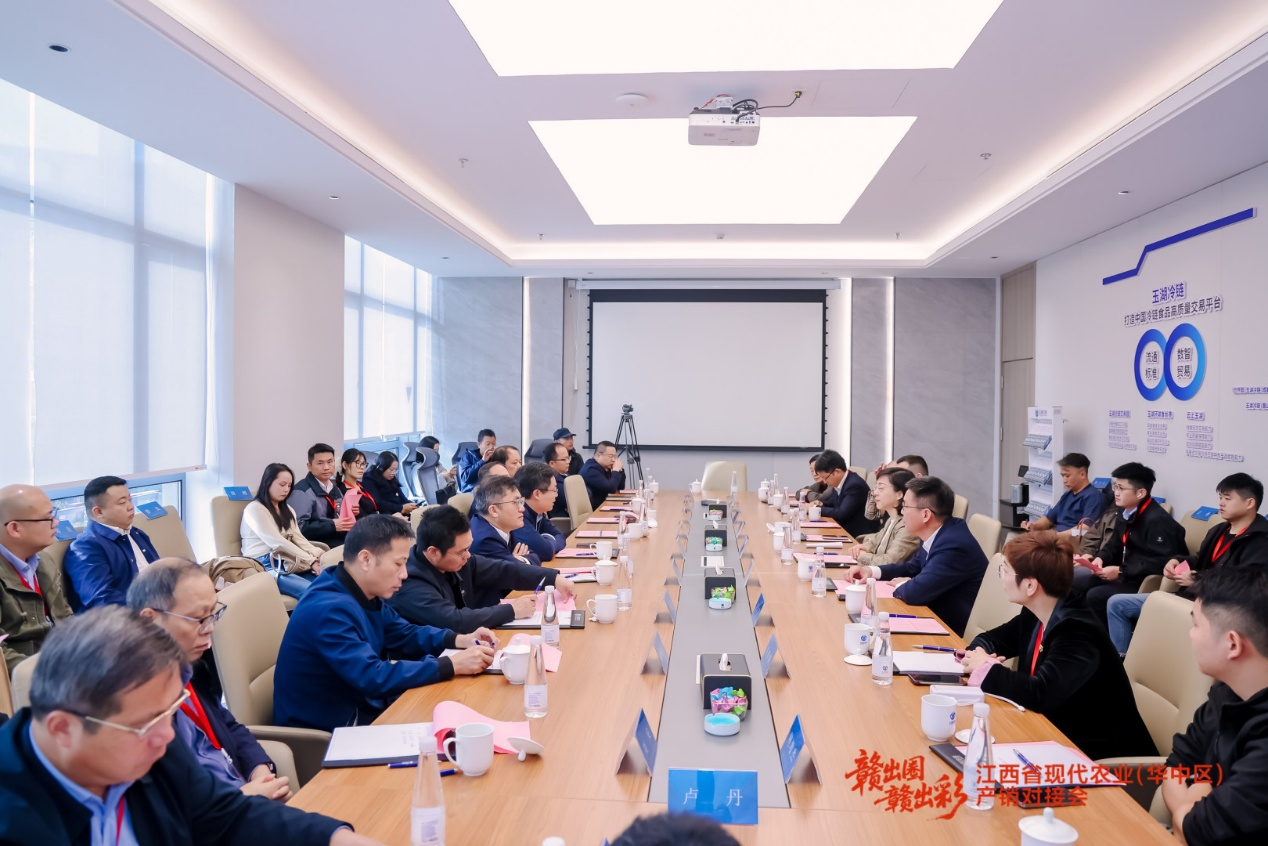 Supply-demand negotiation session between Jiangxi Provincial Department of Agriculture and Rural Affairs, municipal agricultural bureaus, Six-Entry reserve-listed enterprises (i.e., suppliers officially catalogued under the government “Six-Entry” program: entering projects, procurement, inventory, shortlists, platforms and recommendation lists), and Wuhan purchasers.