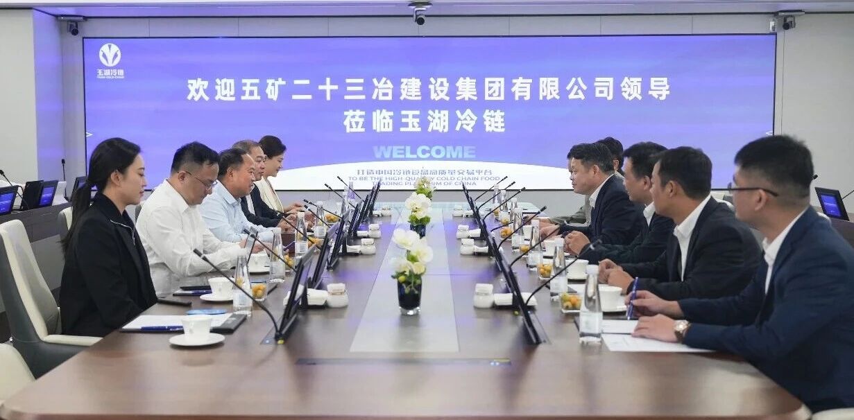 On November 12, Hu Jianjun—Party Secretary and Chairman of The 23rd Metallurgical Construction Group Co., Ltd of Minmetals—led a delegation to visit Yuhu Cold Chain. He met with Huang Xiangmo, Chairman of the Board of Hong Kong Yuhu Group, to discuss the progress of their ongoing projects and ways to deepen their strategic cooperation.