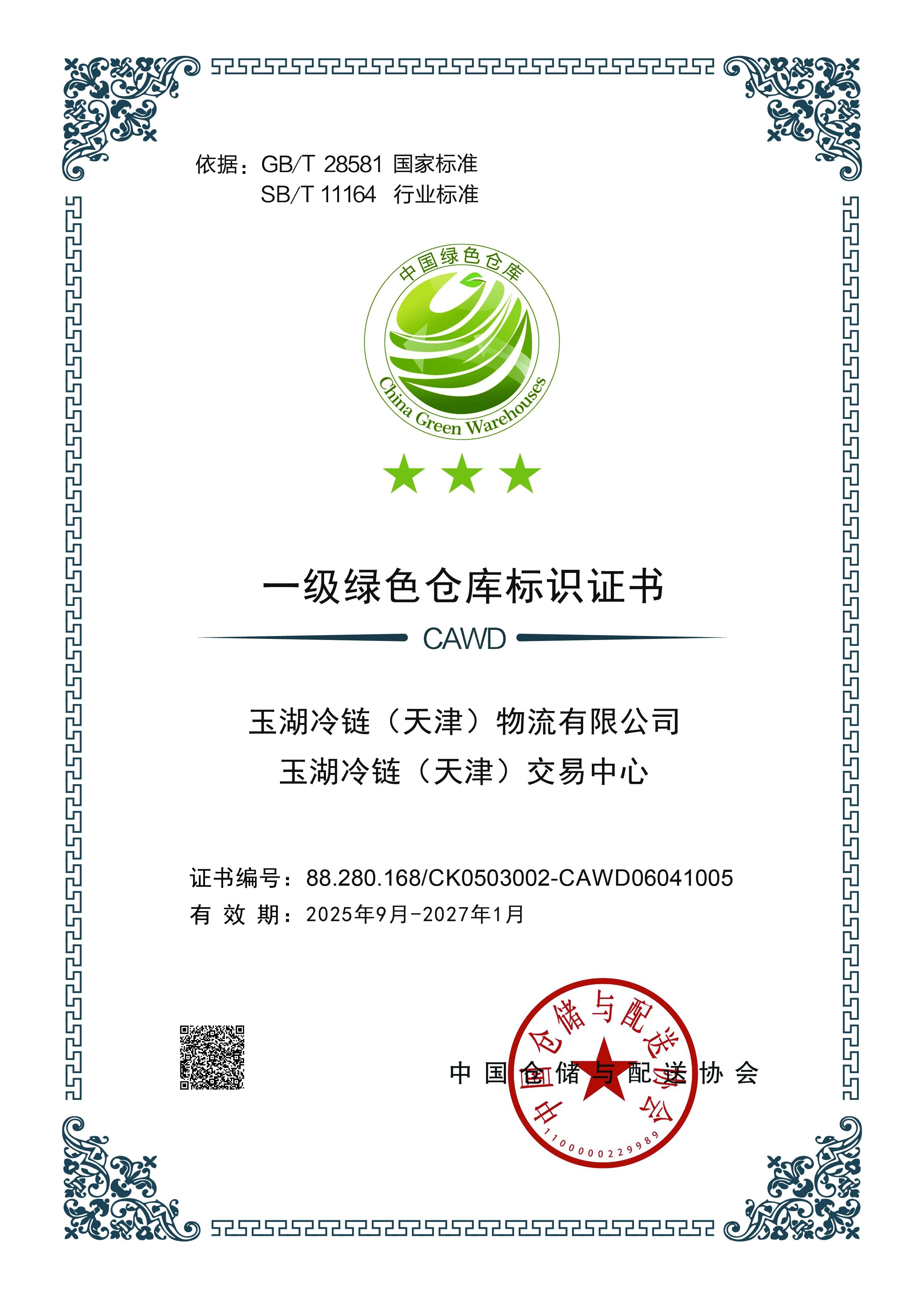第8個“綠倉”!玉湖冷鏈(天津)交易中心獲 “國家一級(三星)綠色倉庫”認證