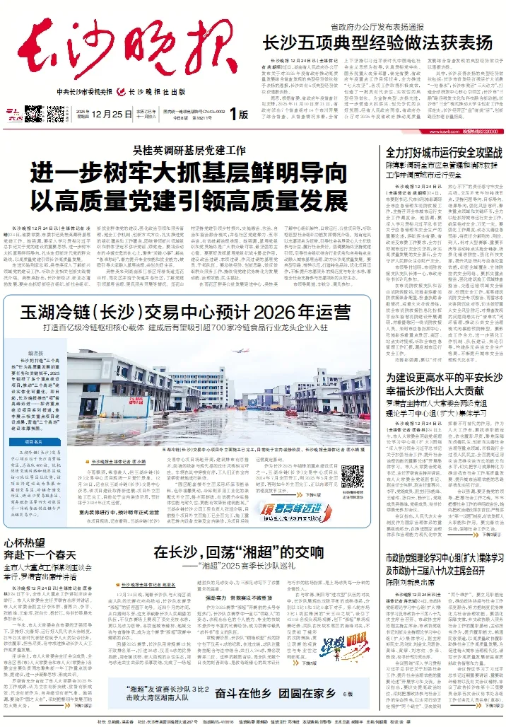 長沙晚報 12 月 25 日頭版聚焦報導玉湖冷鏈長沙項目,記者深入園區實地探訪項目的最新建設進展。報導指出,作為長沙 2025 年鋪排的重點建設項目之一,玉湖冷鏈(長沙)交易中心項目從 2024 年 7 月全面開工,到 2025 年 5 月全面封頂,再到如今外立面完工,正以肉眼可見的速度拔節生長。該中心將推行覆蓋全流程的國際化標準管理體系,從入庫檢驗、倉儲管理到出庫配送,每個環節均制定嚴格的操作規範與品質標準。同時引進先進的冷鏈物流數位化管理系統,實現從倉儲、運輸到配送的全鏈條可視化、可追溯化管理,並通過物聯網技術即時監測溫濕度,確保商品品質。項目建成後,預計將引進超過700家冷鏈食品行業龍頭企業入駐,涵蓋全球食材供應商、本地農產品加工商、跨境貿易服務商等全產業鏈主體。
