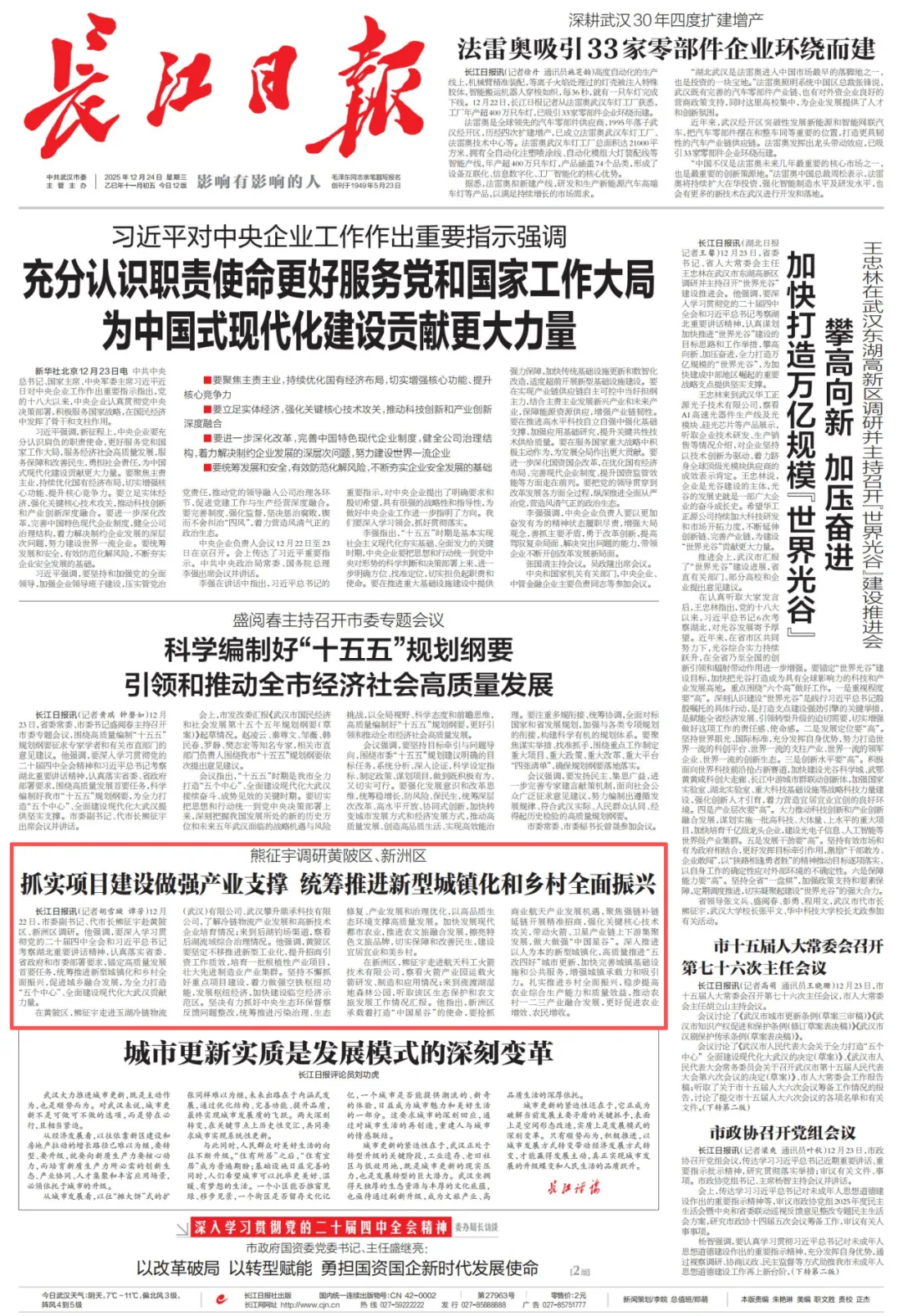長江日報 12 月 22 日頭版報道武漢市市委副書記、代市長熊征宇赴玉湖冷鏈(武漢)交易中心調研,了解冷鏈物流產業發展,要求堅持不懈抓好重點項目建設,着力做強空鐵樞紐功能,發展樞紐經濟,為全力打造「五個中心」、全面建設現代化大武漢貢獻力量。